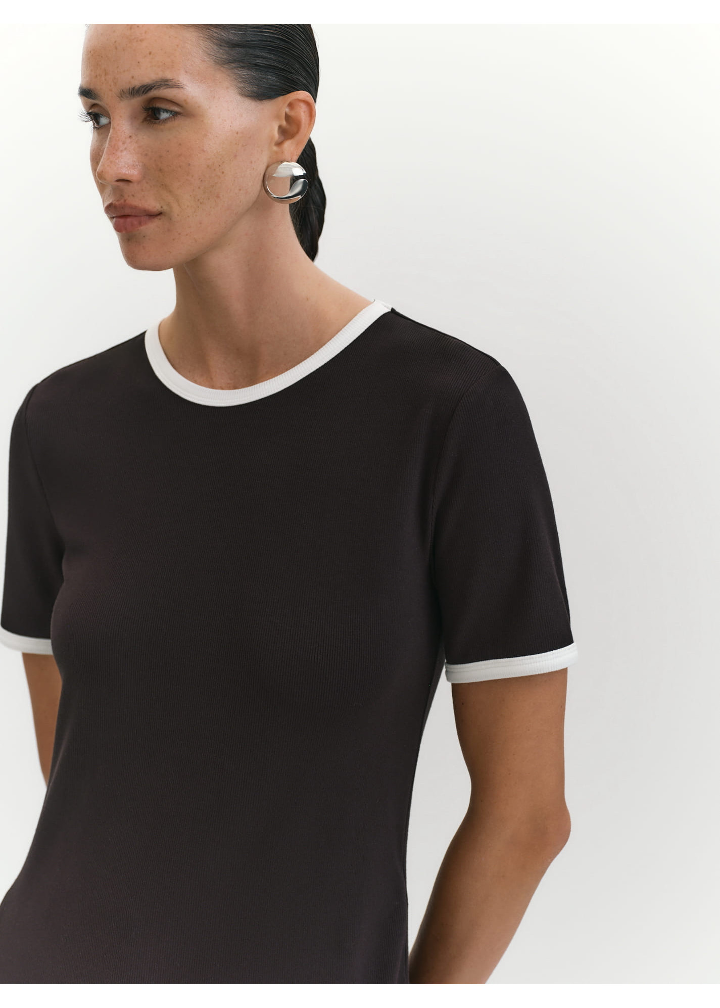 Прилегающая футболка с коротким рукавом зайдет в гардероб как базовая, как единственный слой, и в качестве первого под жакеты и кардиганы. Модель выполнена из трикотажа рибана с высоким тактильным качеством, тонкого, но плотного. Это полотно износостойкое и эластичное. Такая модель в базовом черном цвете создает основу образа и не зависит от сезонов и трендов, контрастный кант футболки достойно завершит образ.